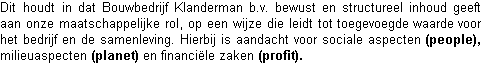 Dit houdt in dat Bouwbedrijf Klanderman b.v. bewust en structureel inhoud geeft aan onze maatschappelijke rol, op een wijze die leidt tot toegevoegde waarde voor het bedrijf en de samenleving. Hierbij is aandacht voor sociale aspecten (people), milieuaspecten (planet) en financiële zaken (profit).